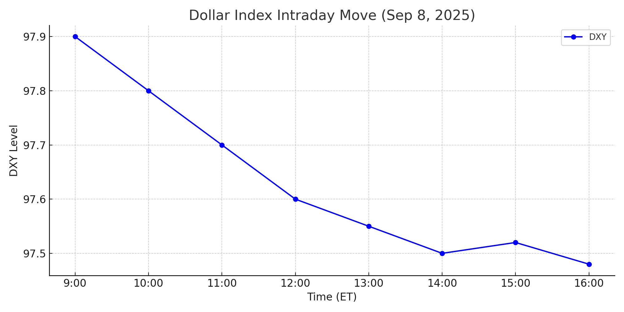 Dollar Index (DXY) fell ~0.25% intraday, sitting at 97.5 at 14:35 ET.