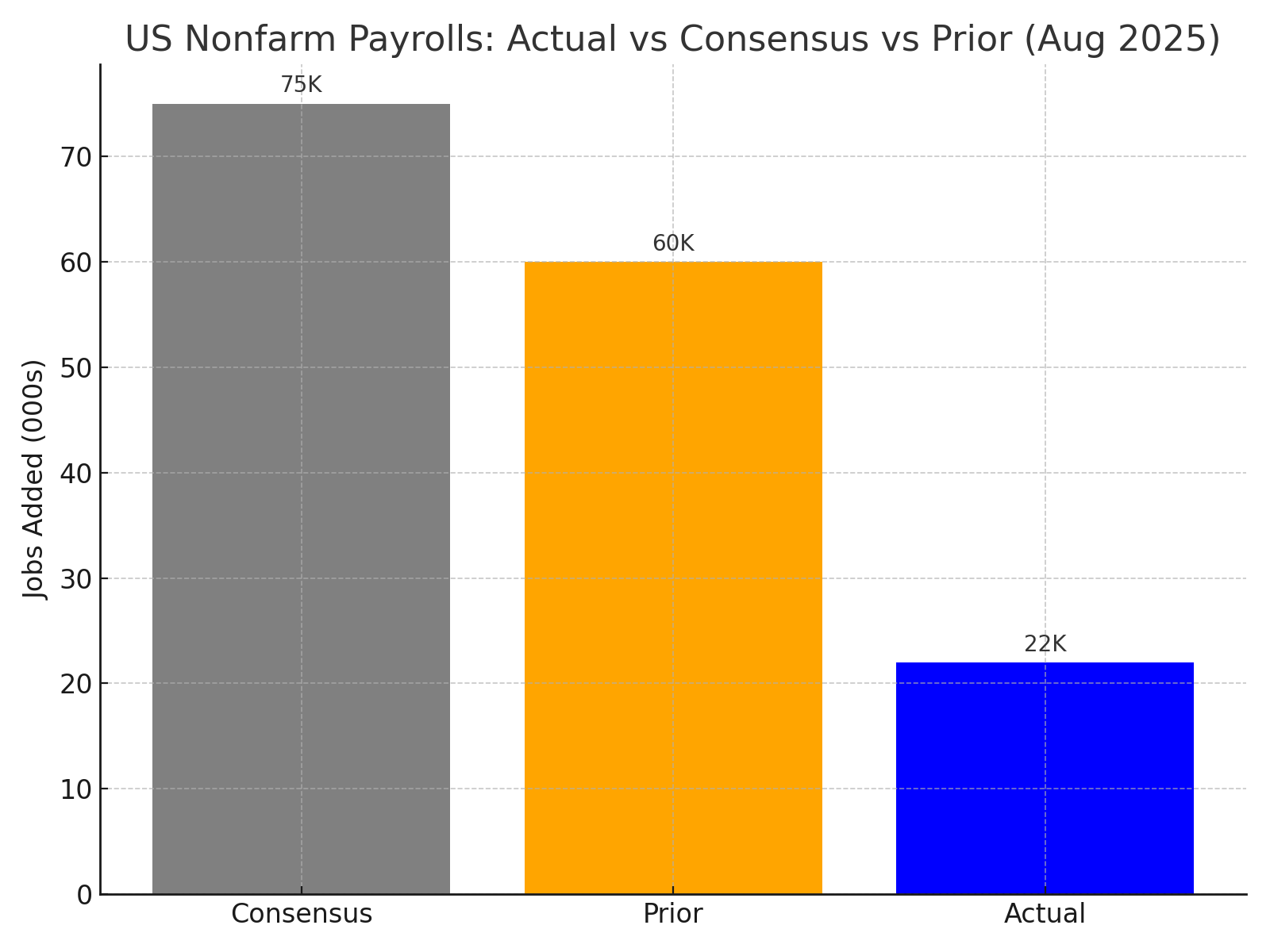 U.S. Nonfarm Payrolls (NFP) added just 22K jobs in August vs. 75K expected; prior revised to 60K.