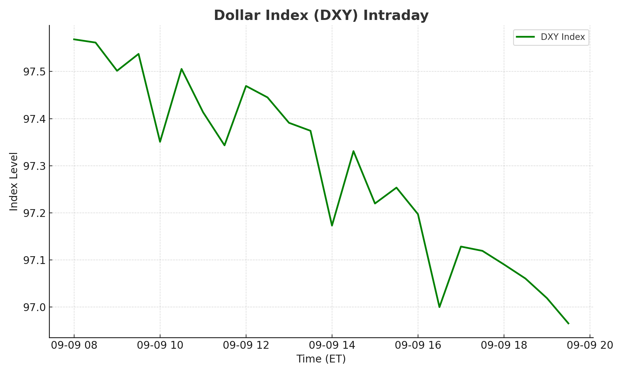 U.S. Dollar (DXY): Fell ~0.3% intraday after jobs revision (latest DXY at ~97.00). (unverified; observed across FX commentary.)